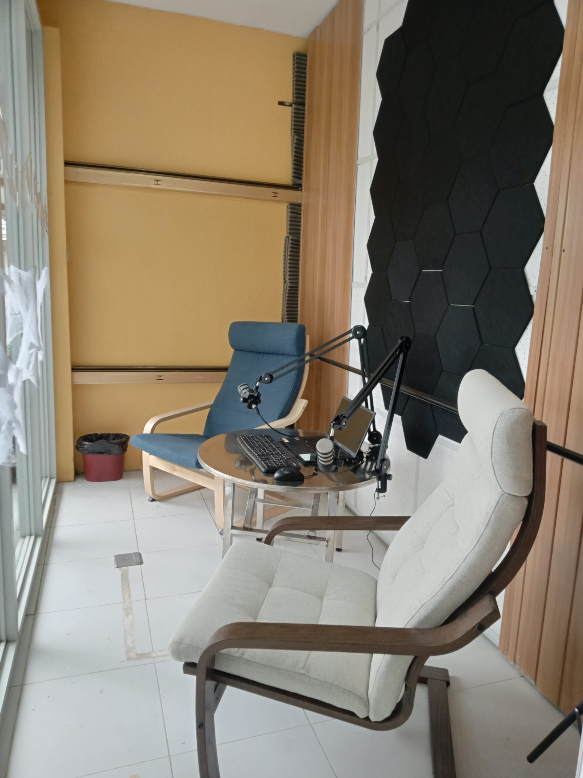 An 8ft x 4ft podcasting and live streaming room with two lounge chairs, one laptop with webcam and video editing software, two microphones on microphone boom arms. Great for vloggers or live online sellers! First come first served basis. Reservation of time and day can be done on our booking page. Walk-ins are welcome but have to follow the queue.